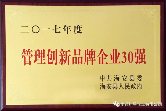 南通科星化工有限公司榮獲“管理創(chuàng)新品牌企業(yè)30強(qiáng)”、“工業(yè)百?gòu)?qiáng)企業(yè)”兩大榮譽(yù)稱(chēng)號(hào),這對(duì)科星來(lái)說(shuō)既是榮譽(yù)也是動(dòng)力。